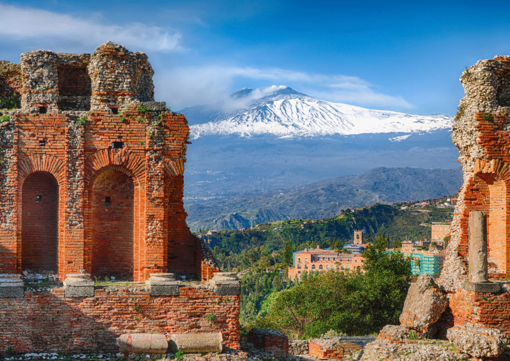 Taormina is a mix of ancient ruins and modern style, with Mount Etna in the background.