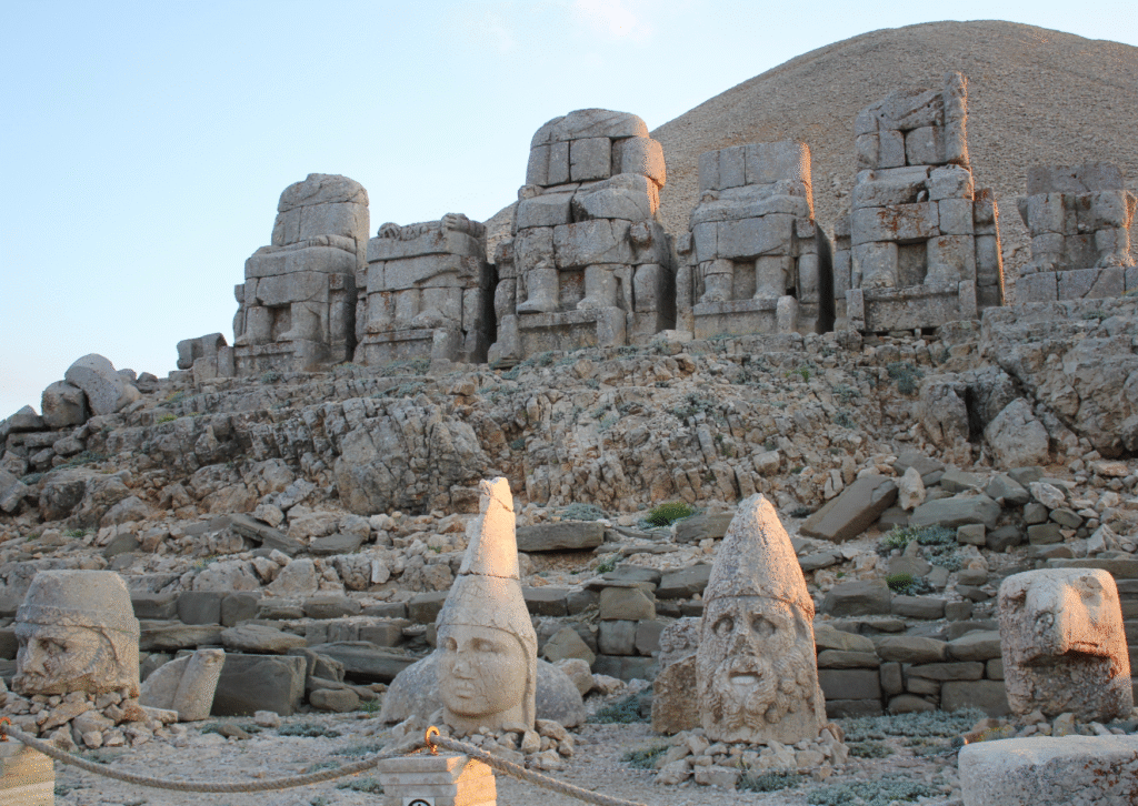 A beautiful ruined mountainside with huge stone sculptures on either side of King Antiochus’s tomb and shrine.
