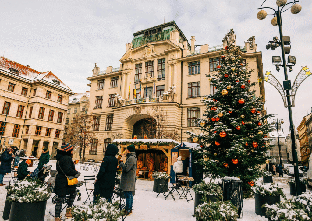 Two of the most beautiful Christmas markets in Prague are in Old Town Square and Wenceslas Square. The Gothic buildings, cobblestone streets and sparkling lights make the storybook effect even stronger. People can eat Trdelník, a delicious pastry with cinnamon as well as typical Czech sausages and hot wine.